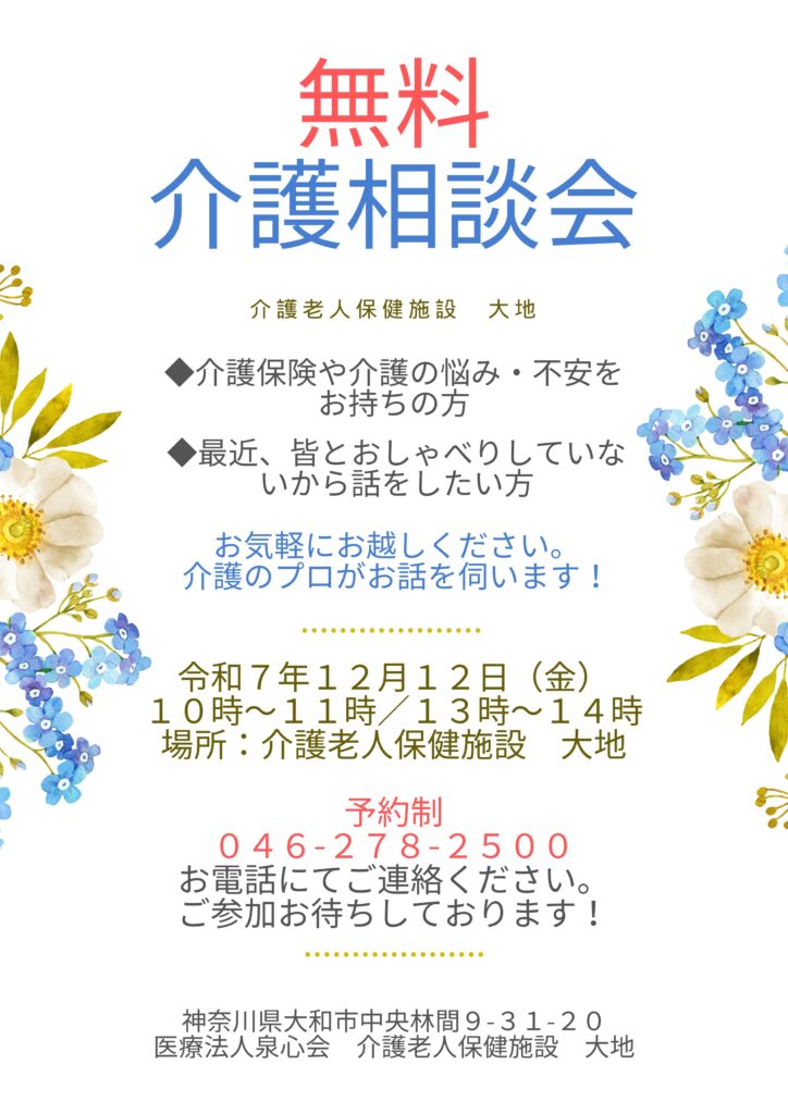 ★無料介護相談会のお知らせ★ 2025.11.27 介護の悩みを相談する場がない、最近人と話していいなくて不安・話したい、 といったお悩みを抱える方、多いのではないでしょうか? 私たち大地スタッフが、皆さまの悩みに寄り添い、お手伝いいたします。 予約:046-278-2500(大地 事務局)